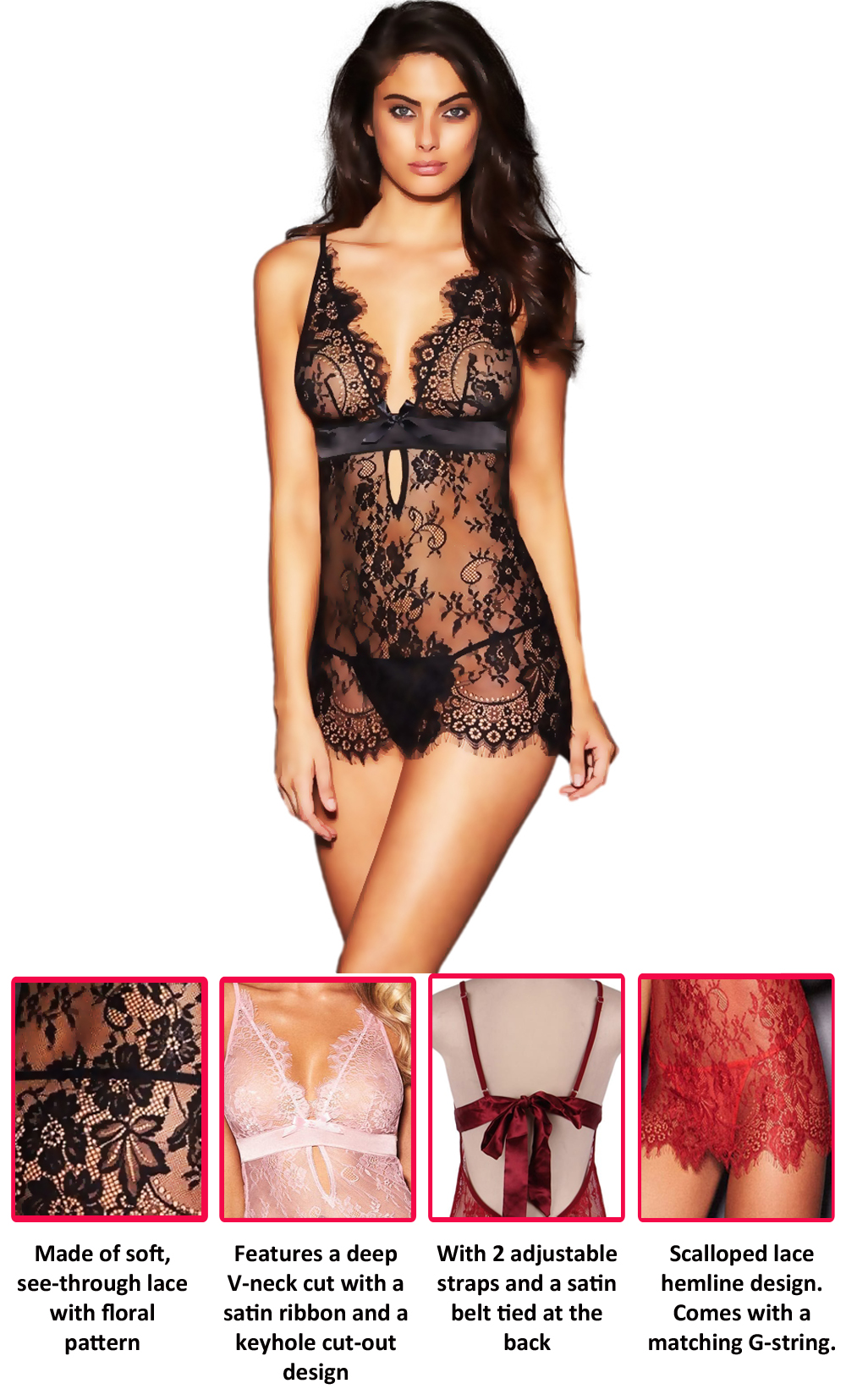 What else could be sexier than see-through lace? This gorgeous eyelash lace sexy babydoll features lace with an exquisitely intricate pattern.